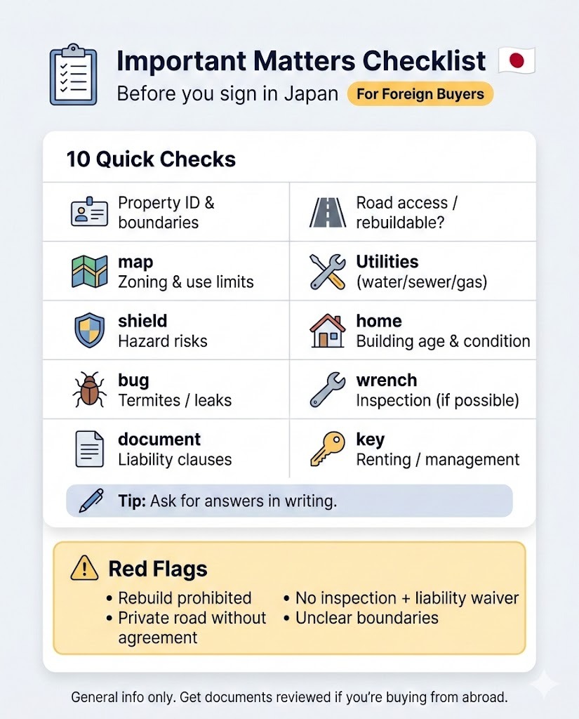 For foreign buyers, this is one of the most important steps in the entire purchase. It’s where many deal-breaking issues (road access, rebuilding restrictions, hidden risks, usage limits, etc.) are revealed—sometimes in Japanese legal terms that are easy to miss.